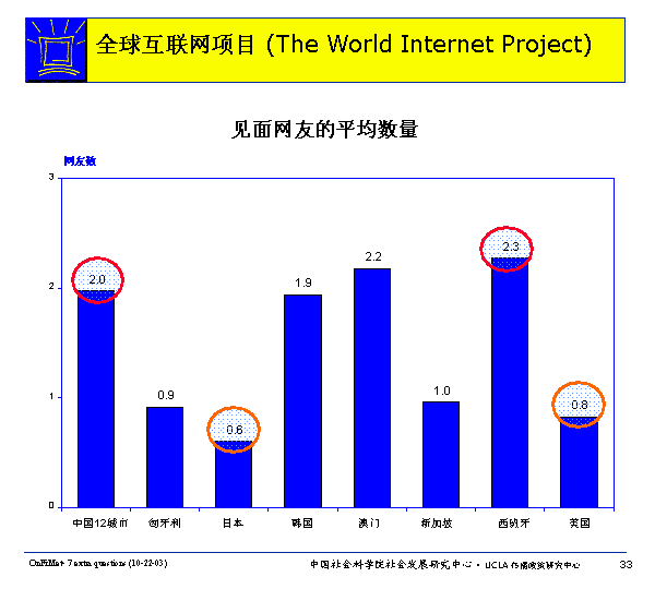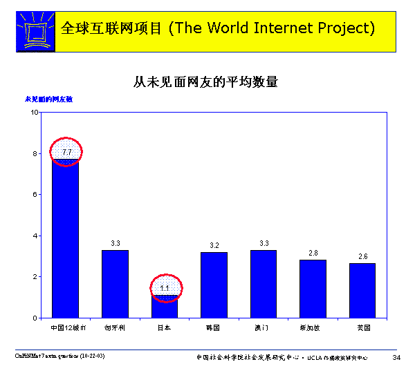 不同國(guó)家的網(wǎng)民中從未和網(wǎng)友見(jiàn)面的人的比例也不相同。在這方面,中國(guó)網(wǎng)民中從未和網(wǎng)友見(jiàn)面的人數(shù)最高,達(dá)到了7.7%,而日本則最低(1.1)。當(dāng)然,這還需要參照各國(guó)網(wǎng)民實(shí)際在網(wǎng)上交友的數(shù)量進(jìn)行比較研究。