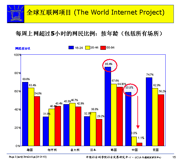 在德國、韓國、中國和美國,年輕網(wǎng)民比年齡大的網(wǎng)民更可能每周上網(wǎng)5小時(shí)以上。