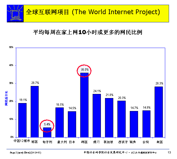 在WIP的國家里,韓國的每周在家上網(wǎng)平均10小時(shí)或更多的網(wǎng)民比例最高。36%的韓國網(wǎng)民每周在家上網(wǎng)平均10小時(shí)或更多,匈牙利網(wǎng)民只有5.4%如此。
