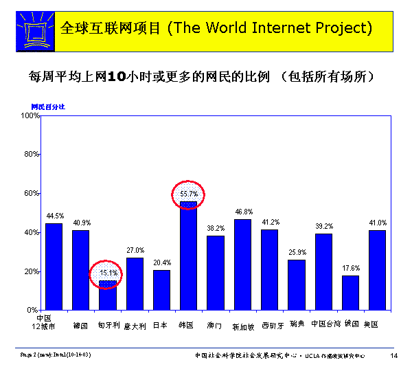 每周上網(wǎng)時(shí)間最多的是韓國人,55.7%網(wǎng)民每周上網(wǎng)10小時(shí)或更多(包括所有場所) ,匈牙利比例最低,只有15.1%的網(wǎng)民。