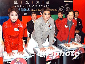 蕭芳芳、劉德華、芳艷芬齊為香港《星光大道》打手印。1月5日,香港舉行《星光大道》第四次打手印儀式,三位為香港影壇作出貢獻(xiàn)的影星蕭芳芳、劉德華、息影女星芳艷芬為香港《星光大道》打手印。作者:鄧慶樂