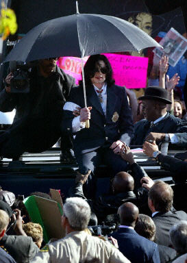 杰克遜在抵達加州圣瑪麗亞法庭時受到一群手持歡迎標語牌和支持條幅的歌迷的歡迎。杰克遜是於去年11月被捕的,原因是他被一名10幾歲男童的家庭告到警察局。邁克爾杰克遜不久前開始在圣瑪麗亞第一次出庭,圣瑪麗亞是加利福尼亞中部的一個小鎮(zhèn),這個小鎮(zhèn)以前還沒有經(jīng)歷過這樣的大事。