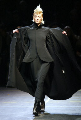 1月18日在法國巴黎,模特演繹了在服裝界中素有藝術(shù)家美稱的日本服裝設(shè)計師——山本耀司設(shè)計的2004春夏時尚女裝。