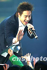 一月十八日晚,中央電視臺《音樂現場》春節(jié)特別節(jié)目“紅歌匯2003之攜手同行、治安之歌——慰問首都公安干警演唱會”在北京舉行,著名歌手潘瑋柏受到歌迷的熱烈歡迎。中新社記者:盛佳鵬