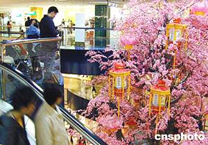 香港太古城裝飾新年裝飾,巨大的桃花樹(shù)上懸掛宮燈,營(yíng)造節(jié)日氣氛。作者:洪少葵