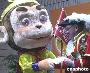 一月十九日在香港舉行的“2004國(guó)泰航空新春國(guó)際匯演”發(fā)布會(huì)上,猴年吉祥物“美猴王”在會(huì)上熱烈歡迎參加匯演的各國(guó)表演隊(duì)。作者:錢興強(qiáng)