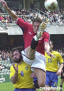 “2004嘉士伯杯”足球邀請賽元月二十二(農(nóng)歷年初一)在香港大球場舉行,在首場比賽中瑞典隊與挪威隊對陣,圖為瑞典隊球星在場上展示精彩球技。作者:錢興強(qiáng)