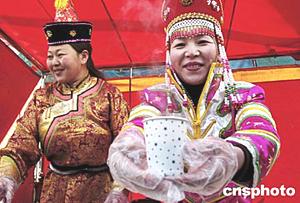 來自中國內(nèi)蒙古錫林郭勒草原的姑娘烏云格日格(右)與嫂子道日娜,春節(jié)期間來到北京參加廠甸春節(jié)廟會,經(jīng)營內(nèi)蒙古草原風(fēng)味小吃,并高興地向來賓捧上一杯杯香噴噴、熱騰騰的奶茶。中新社記者:鄒憲