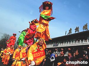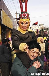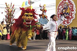 北京城南的春節(jié)廟會上,山西省大同地區(qū)民間特有的“撓擱”表演吸引無數(shù)市民追隨觀看。中新社記者:王麗南