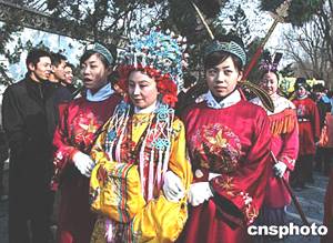 以中國古典名著《紅樓夢》為題材建設(shè)的北京大觀園公園,農(nóng)歷春節(jié)期間舉行“元妃”省親大游行,一所中學(xué)的學(xué)生裝扮成《紅樓夢》中的宮女陪“元春”游園。中新社記者:王麗南
