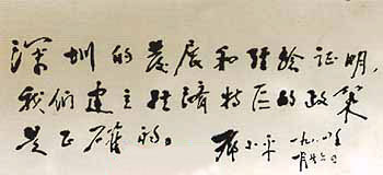 鄧小平散步回來,一進(jìn)1號(hào)樓,就坐在門左邊的沙發(fā)上休息。李天增將深圳寫好的、作參考的紙條拿給小平同志,紙條上擬寫了幾條:深圳特區(qū)報(bào)、深圳青年報(bào)、大鵬展翅,這張紙條曾給吳南生同志看過,他又加了一條:堅(jiān)持改革開放,繼續(xù)辦好特區(qū)。鄧小平一看,說:“要寫這么多呀?”李天增說:“這是深圳同志拿來的,不受這個(gè)限制,您想寫什么就寫什么!编囆∑诫S手丟開紙條,胸有成竹地走向辦公臺(tái),拿起了筆,才寫了幾個(gè)字,粘住了。李天增暗罵自己笨,房間里有暖氣,蘸在毛筆上的墨粘結(jié)了。他趕緊添水研墨后,換張紙,鄧小平重新提起了筆。這一次,他一揮而就:“深圳的發(fā)展和經(jīng)驗(yàn)證明,我們建立經(jīng)濟(jì)特區(qū)的政策是正確的。”