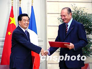 今天是中法建交四十周年紀(jì)念日,正在法國進行國事訪問的中國國家主席胡錦濤和希拉克在巴黎進行了正式會談,會談后雙方簽署了“中法聯(lián)合聲明”。該聲明強調(diào),中法兩國將深化全面戰(zhàn)略伙伴關(guān)系,致力于建立更加安全、更加尊重多樣性和更加團結(jié)的世界。作者:蔚中