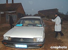 疫區(qū)工作人員對(duì)出入車輛進(jìn)行嚴(yán)格消毒。作者:艾啟平 徐晶波