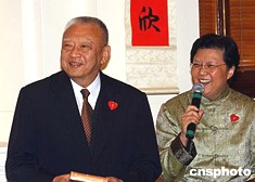 香港立法會議員與行政長官董建華、行政會議成員及政府高官,一月三十日在立法會大樓宴會聽歡聚一堂,共享新春午宴,圖為董建華與立法會主席范徐麗泰為“趣怪立法會”選舉游戲得獎者頒獎。作者:潘索菲