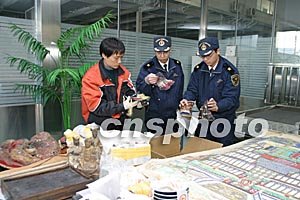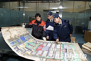 在北京海關(guān)空運(yùn)快件監(jiān)管中心查驗現(xiàn)場,包括古舊女士布鞋、面具、人像木雕、陶瓷茶壺、繡品在內(nèi)的80余件文物擺滿了海關(guān)查驗臺。在這次查獲的文物中,最為珍貴的就是一支古舊陶罐。該陶罐呈灰黑色,大概有20厘米高,罐口直徑有7、8厘米。在陶罐的表面刻有“康熙22年制”字樣。另據(jù)專家介紹,此次查獲的兩幅祖宗圖也極為珍貴,兩幅圖分別為祖宗牌位圖和人像圖。人像圖近3米見方,牌位圖也有1.2米寬,2米多長。專家稱,這三件文物均屬于國家禁止出境的文物。