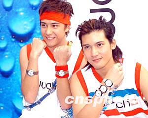 樂壇組合Boy'Z兩名成員關(guān)智斌(Kenny)、張致恒(Steven)(左)2月12日在香港出席品牌SWATCH 2004春夏腕表系列發(fā)布會,兩人并為SWATCH展示新系列腕表。作者:鄧慶樂