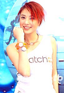歌星鄭希怡2月12日在香港出席品牌SWATCH 2004春夏腕表系列發(fā)布會,鄭希怡為SWATCH展示新系列腕表。作者:鄧慶樂