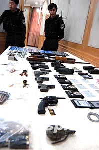 二月十三日,北京警方舉行新聞發(fā)布會,通報綁架中央實驗話劇院演員吳若甫的詳細案情,并展示以王立華為首的持槍綁架殺人犯罪團伙的作案工具。中新社記者:任海霞
