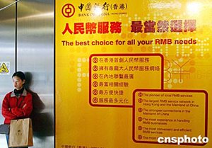日前,中國人民銀行行長周小川來香港參加國際結(jié)算銀行會議時表示,繼人民幣信用卡已在香港使用后,香港銀行將在二月二十五日起,可以開辦個人人民幣業(yè)務(wù),包括人民幣存款和匯款業(yè)務(wù)。近日,中銀香港已在報章等媒體展開人民幣業(yè)務(wù)的宣傳,在地鐵站口人民幣業(yè)務(wù)的廣告十分醒目。作者:錢興強