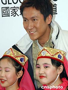 香港藝員馬德鐘二月十七日出席在香港舉行的“馬可波羅現(xiàn)代東游記”攝影展開幕式,與表演新疆舞的小朋友一起拍照。作者:錢興強