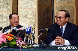 中國商務(wù)部副部長安民(右)、香港特區(qū)政府財政司司長唐英年等出席了簽署儀式,并就相關(guān)問題回答了記者提問。中新社記者:武仲林