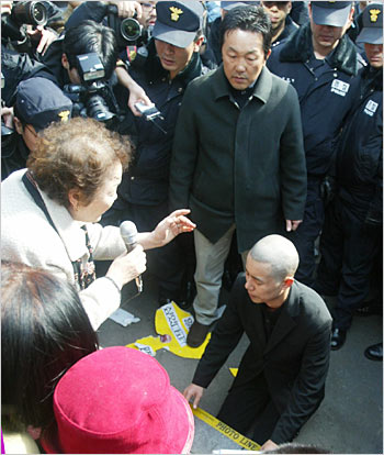 從上午11時(shí)30分起,8名慰安婦和30名韓國婦女團(tuán)體成員在該娛樂公司總部前舉行示威,要求李成延和公司負(fù)責(zé)人直接道歉。下午1時(shí)30分,抗議者表示“要讓公司負(fù)責(zé)人道歉”,并試圖闖進(jìn)公司。此時(shí),樸智友來到眾人前,朗讀道歉聲明,并跪在慰安婦老人面前表示歉意。
