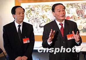 二月二十一日,王岐山(右)在北京人大會(huì)議選舉市長投票結(jié)束后,看望議案組工作人員。中新社記者:張宇