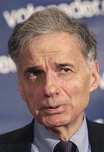 本周即將年滿七十的納德二000年曾經(jīng)以綠黨候選人的身份參與總統(tǒng)大選角逐,雖然僅獲得百分之二點(diǎn)七的選票,但因?yàn)椴际苍诜鹆_里達(dá)和新罕布什爾兩州僅以微弱的優(yōu)勢(shì)壓倒戈?duì),取得這兩州的選舉人票而登上總統(tǒng)寶座,民主黨人認(rèn)為納德的得票分流了本來(lái)支持戈?duì)柕倪x民,導(dǎo)致戈?duì)柭鋽 ?div align="left">