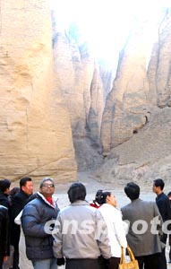 中國國土資源部日前公布,四川九寨溝、甘肅景泰石林等被評為“國家地質(zhì)公園”。甘肅景泰石林位于甘肅省景泰縣,生成于四百萬年前,由地殼運動、風(fēng)化、流水侵蝕和重力崩塌形成,其石柱、石筍均由桔黃色砂礫巖構(gòu)成,大多高達(dá)八十至一百米之間,最高達(dá)二百多米。圖為聯(lián)合國教科文基金水利工程協(xié)會的專家前來考察屹立在黃河兩岸的甘肅景泰石林。作者:殷春永