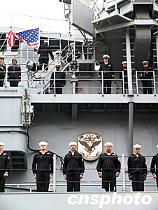 中國(guó)海軍東海艦隊(duì)司令員趙國(guó)鈞中將在碼頭舉行儀式,歡迎美艦到訪。