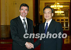 國務(wù)院總理溫家寶二十六日在北京會(huì)見丹麥?zhǔn)紫嗬鼓律。中新社記?滿會(huì)喬