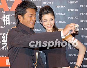 歌影紅星古天樂(lè)2月26日在香港出席《PENTAX賓得數(shù)碼相機(jī)代言人簽約儀式》記者會(huì),古天樂(lè)會(huì)上與模特試用代言的數(shù)碼相機(jī)自拍。作者:鄧慶樂(lè)