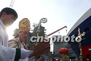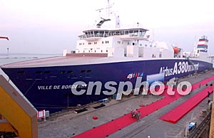 運(yùn)輸世界最大客機(jī)——歐洲空中客車A380部件的滾裝船,二月二十七日在南京被正式命名為“波爾多城號(hào)”,中國神職人員出席了命名儀式并為南京金陵造船廠建成的這艘5200噸滾裝船祝福。據(jù)悉,載客555位的空中客車A380是世界最大的雙層艙客機(jī),它特別看好北京奧運(yùn)會(huì)和上海世博會(huì)的龐大航空市場(chǎng)。中新社記者:賈國榮