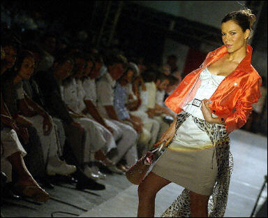 面對著6組射程在38公里的“飛魚”導(dǎo)彈的發(fā)射裝置,在2門100毫米口徑的自動炮的下面,一條長達40米的白色塑料毯上,模特們展示著各名家的服裝作品。