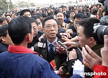 下午二點多,距全國政協(xié)十屆二次會議開幕尚有半個小時,但人民大會堂前已聚滿海內(nèi)外記者,各路英雄架起長槍短炮,敬候“獵物”。