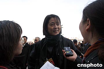 今天的倪萍穿著一身黑衣,低著頭步履匆匆前行,她還不時(shí)警惕地向左右看看,企圖躲避記者聚集的地方,眾多記者的目光已被一旁的楊瀾吸引過去,還沒注意到她。但就當(dāng)她快要走到大會堂前的臺階時(shí),被幾個(gè)熟識的記者攔住了去路。