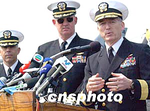 美國太平洋第七艦隊(duì)?wèi)?zhàn)斗群司令凱利(右一)在“小鷹”號航空母艦舉行的歡迎儀式上,向媒體介紹該有關(guān)情況及回答記者問。作者:錢興強(qiáng)