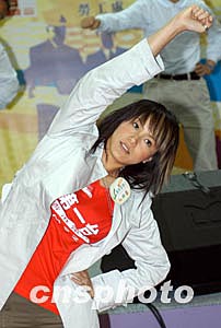 歌星何韻詩3月6日在香港出席由職安局及勞工處舉辦之《職安健康日2004》開幕典禮活動(dòng),「職安領(lǐng)隊(duì)」何韻詩帶領(lǐng)出席嘉賓及歌星進(jìn)行健康操,宣揚(yáng)職業(yè)安全信息。作者:鄧慶樂