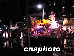 澳洲第一大城市悉尼6日晚舉行同性戀大游行,十萬人冒雨上街看熱鬧。幾十輛花車、數(shù)千人的化裝游行隊(duì)伍在雨水中緩緩行進(jìn)。最后一輛花車上書“要愛不要戰(zhàn)爭(zhēng)”! ≈行律缬浾 劉雨生 攝