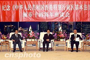 是次在人民大會堂香港廳舉行的座談會由全國人大常委會法制工作委員會、全國政協社會和法制委員會、全國人大常委會香港基本法委員會聯合舉辦。中共中央政治局委員、全國人大常委會副委員長王兆國,國務委員唐家璇,全國政協副主席廖暉、劉延東,部分港區(qū)全國人大代表、全國政協委員,全國人大常委會香港基本法委員會委員,當年參加基本法起草的人士、法律專家及有關部門負責人出席。