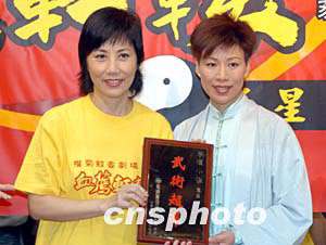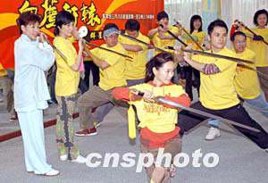 古裝武俠劇《血薦軒轅》劇中眾藝員3月17日在香港齊集李暉武術(shù)文化中心,邀請(qǐng)武術(shù)名師李暉小姐教授舞刀劍耍太極,為感謝李暉親自指導(dǎo),“阿姐”汪明荃代表無(wú)線電視向她贈(zèng)送印有「武術(shù)超群」牌匾。作者:鄧慶樂(lè)