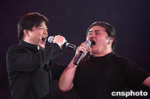 “歡歌2004演唱會”在座無虛席的首都體育館隆重上演,中國內(nèi)地歌手劉歡(右)與特邀嘉賓香港歌手莫華倫一起為到場歌迷獻上了眾多耳熟能詳?shù)母枨W髡?高遠