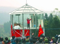 昨日,是“東方超人”陳建民正式挑戰(zhàn)饑餓極限49天的日子。記者(注:成都日報記者)早早來到陳建民挑戰(zhàn)地點(diǎn)碧峰峽景區(qū),而英國天空電視臺、中央電視臺、新華社等國內(nèi)外媒體也早已全副武裝。剛進(jìn)碧峰峽,只見專程為陳建民表演而量身定做的16平方米的八角玻璃房已架在四根14米高柱子上,整個玻璃房懸在半空,以便所有人都能仔細(xì)看到他在房里的一舉一動。