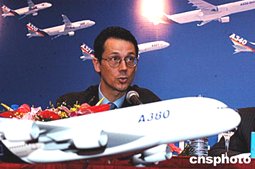 空中客車公司價(jià)格政策高級(jí)副總裁奧利維安德列斯,三月二十四日在北京介紹擁有555個(gè)座位的超大型飛機(jī)-A380飛機(jī),并對(duì)中國(guó)市場(chǎng)前景極為樂觀。首架A380飛機(jī)今年五月開始總裝,二零零六年計(jì)劃投入運(yùn)營(yíng)。作者:王麗南