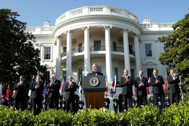 29日,美國(guó)總統(tǒng)布什在白宮對(duì)加入“北約”的7國(guó)表示了歡迎談話。北約將于4月2日在布魯塞爾總部舉行典禮,慶祝北約東擴(kuò)。但事實(shí)上從29日起,該7國(guó)已開始被正式視為“北約”成員!氨奔s”成員國(guó)已增加到26國(guó)。