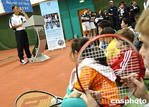 四月三日,美籍華人網(wǎng)球明星張德培應(yīng)北京和睦家醫(yī)院之約,來(lái)到嘉里健身俱樂(lè)部網(wǎng)球中心慈善演講。此次活動(dòng)的門(mén)票收入全部捐獻(xiàn)給美國(guó)教育健康基金會(huì),用于幫助中國(guó)貧困地區(qū)醫(yī)療衛(wèi)生事業(yè)和孤殘病患兒童。作者:賈國(guó)榮