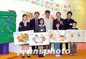 4月7日,香港郵政署發(fā)行《兒童郵票---我最喜愛的玩具和游戲》特別郵票,四位小小設(shè)計師共同展示其設(shè)計之新郵票樣本,并與郵政署長蔣任宏、主禮嘉賓古巨基及贊助商于新郵票發(fā)行儀式上合照。