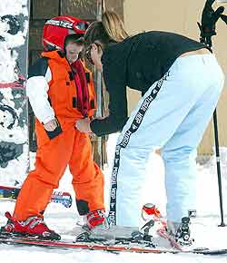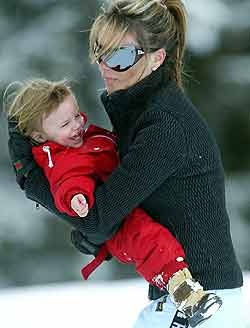 穿著一套桔黃色滑雪服的布魯克林突然開(kāi)始哭起來(lái),原來(lái)他不能從雪橇上立起身來(lái)。維多利亞彎下腰去抱了抱兒子,并幫他整理好衣服,小布魯克林又破涕為笑(見(jiàn)圖二)。隨后,維多利亞抱著18個(gè)月大的小兒子羅密歐在滑雪場(chǎng)的練習(xí)坡地慢慢滑行。維多利亞象蕩秋千一樣輕輕地晃動(dòng)著小家伙,直逗得他在媽媽的懷里咯咯直笑(見(jiàn)圖三)。