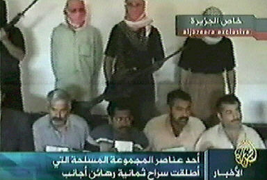 半島電視臺(tái)11日播放的一盤(pán)錄像帶顯示,,伊拉克反美武裝分子即將釋放8名外國(guó)人質(zhì),包括2名土耳其人、3名巴基斯坦人、1名尼泊爾人、1名菲律賓人和1名印度人。
