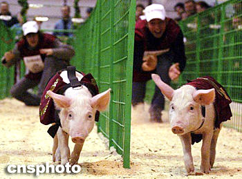 “小豬快跑奧運(yùn)會(huì)”最近在俄羅斯首都莫斯科開鑼,憨態(tài)可掬的小豬們?cè)诒荣愔袀(gè)個(gè)奮勇爭(zhēng)先,一顯“英雄本色”,令到場(chǎng)觀眾忍俊不禁。Ic/cnsphoto 攝
